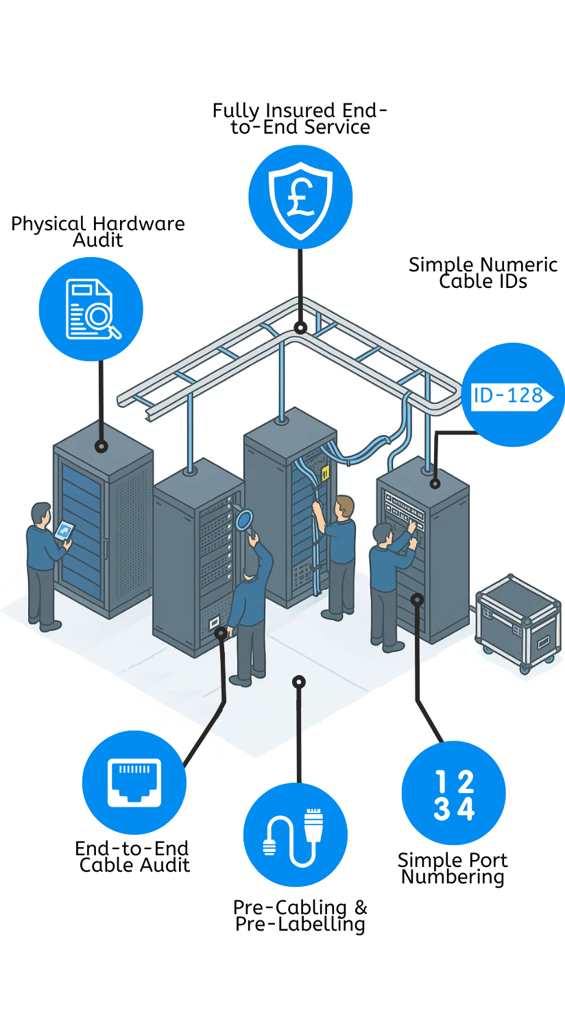 Choose the tier that fits—Pack & Move, De-Rack → Re-Rack, or De-Cable → Re-Cable—and get the same disciplined process, insurance cover, and clean, professional finish.