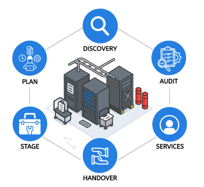 We coordinate end-to-end: audits, ID schemes, pre-cable/pre-label staging, populated rack logistics, chain-of-custody, re-site validation, and documentation. Your PM owns the plan, scope, risk, resources, comms, approvals, and evidence—from the first discovery call to the signed handover.
