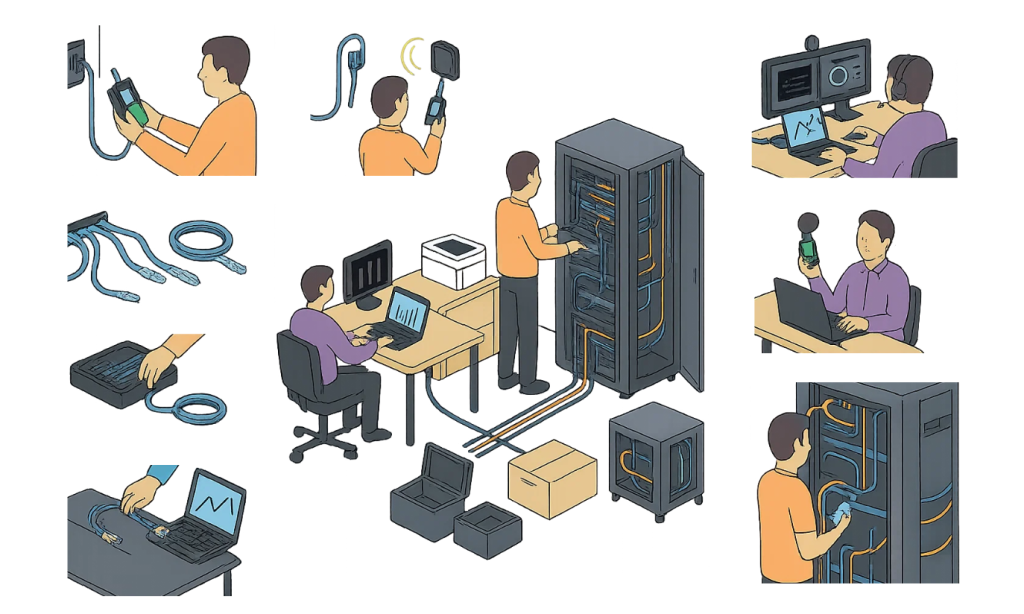 We agree the brief and downtime window, sign in, lay protection, and set up calibrated testers. The PM pins a simple run sheet; we walk the route and execute the plan—from wall plates and table boxes through switches and firewalls to named endpoints. We run tests in order: physical → services → performance → use-case (Wi-Fi join/roam, AV share/EDID, UC call). Quick wins like a bad patch, wrong VLAN or duplex mismatch are fixed with your OK and re-tested. Anything else goes into the exceptions log with an owner and ETA, and we finish with room-by-room or rack-by-rack sign-off.