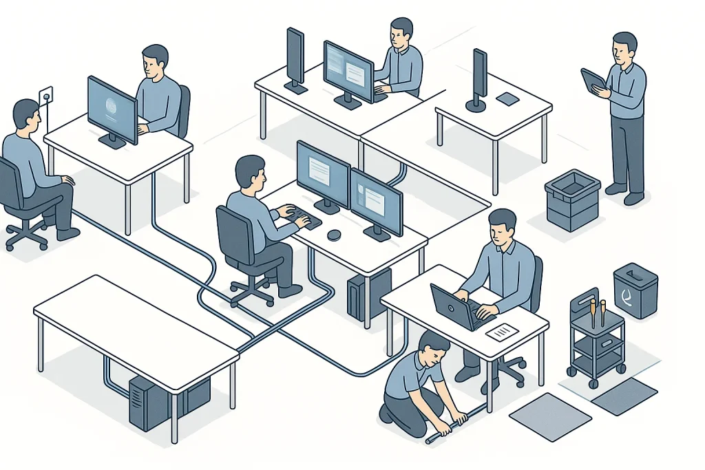 After an office migration we run a quick, evidence-led PC readiness test at each desk. We confirm the user can log in, reach the network, see the right screens in the right order, and that AV (camera, mic, speakers) and headsets work for a real call.