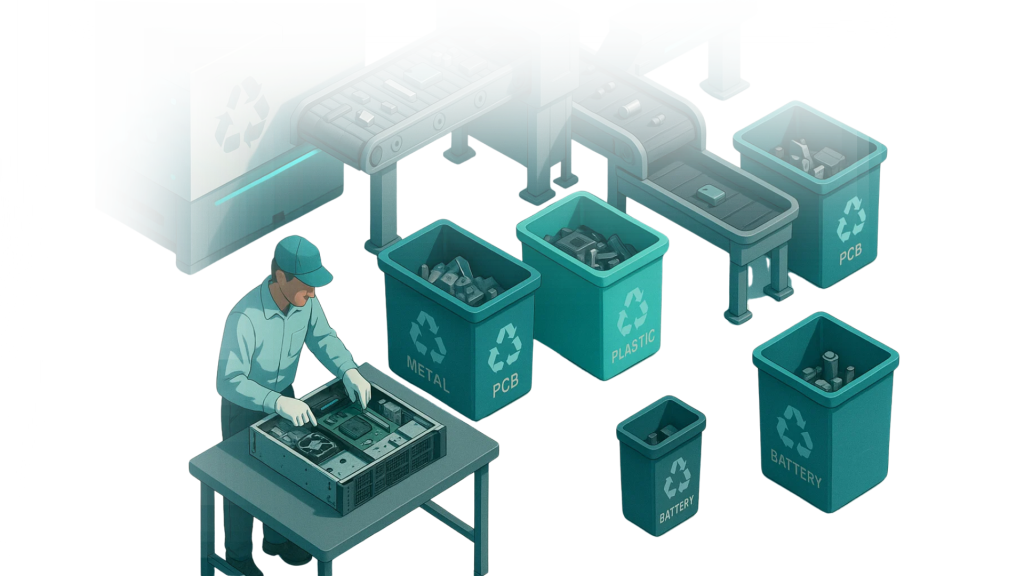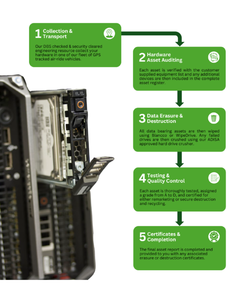 Upon arrival at our secure processing facility, assets are sorted for reuse, remarketing, or responsible recycling. Equipment suitable for redeployment undergoes diagnostics, firmware testing, and secure data erasure using certified software such as Blancco or Global EMEA tools. High-grade components are reconditioned for secondary use or returned for client resale credit. End-of-life materials are channelled through authorised WEEE-compliant recyclers, ensuring every component is handled ethically and transparently.