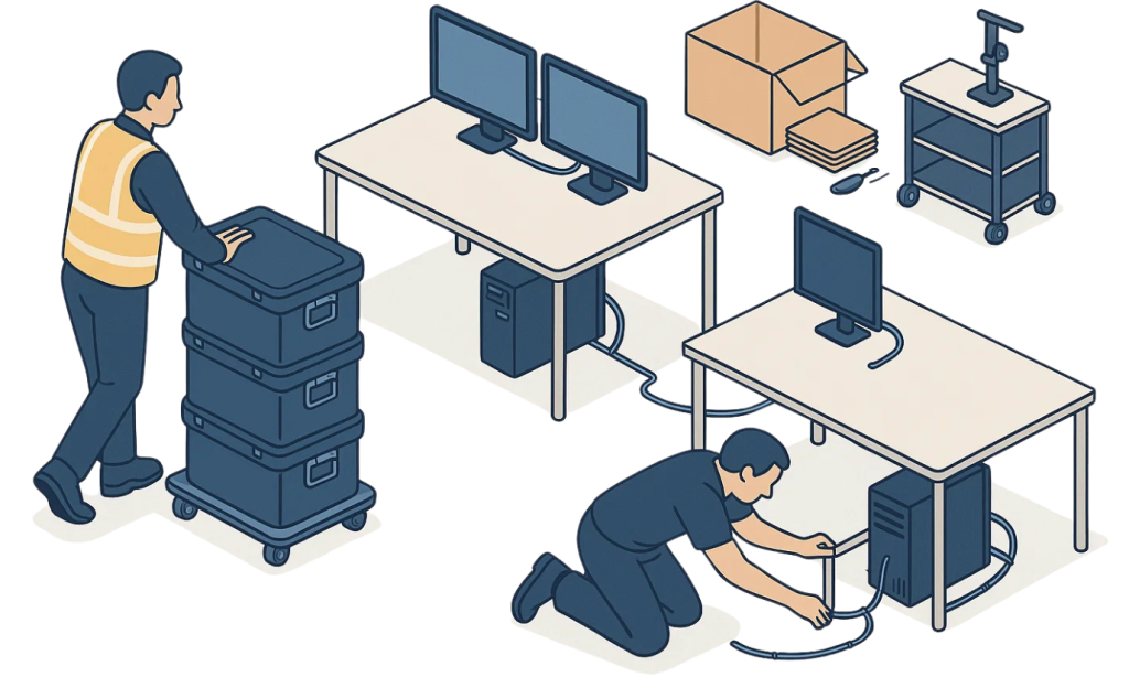 We stage builds in a governed flow: asset capture, imaging (OS (Operating System)/MDM (Mobile Device Management)/apps), user mapping, desk readiness, cable management, QA (Quality Assurance), and floor-walk support. Evidence packs include manifests, photos, and sign-offs.
